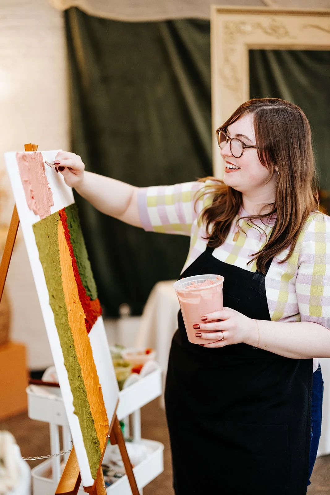 As guests arrived in the Studio, Ashtyn Sibinksi put her finishing touches on an edible painting, created with hummus, chimichurri spread, and more. We were encouraged to slide a slice of pita bread and vegetables through, adding our own unique additions to the abstract piece.