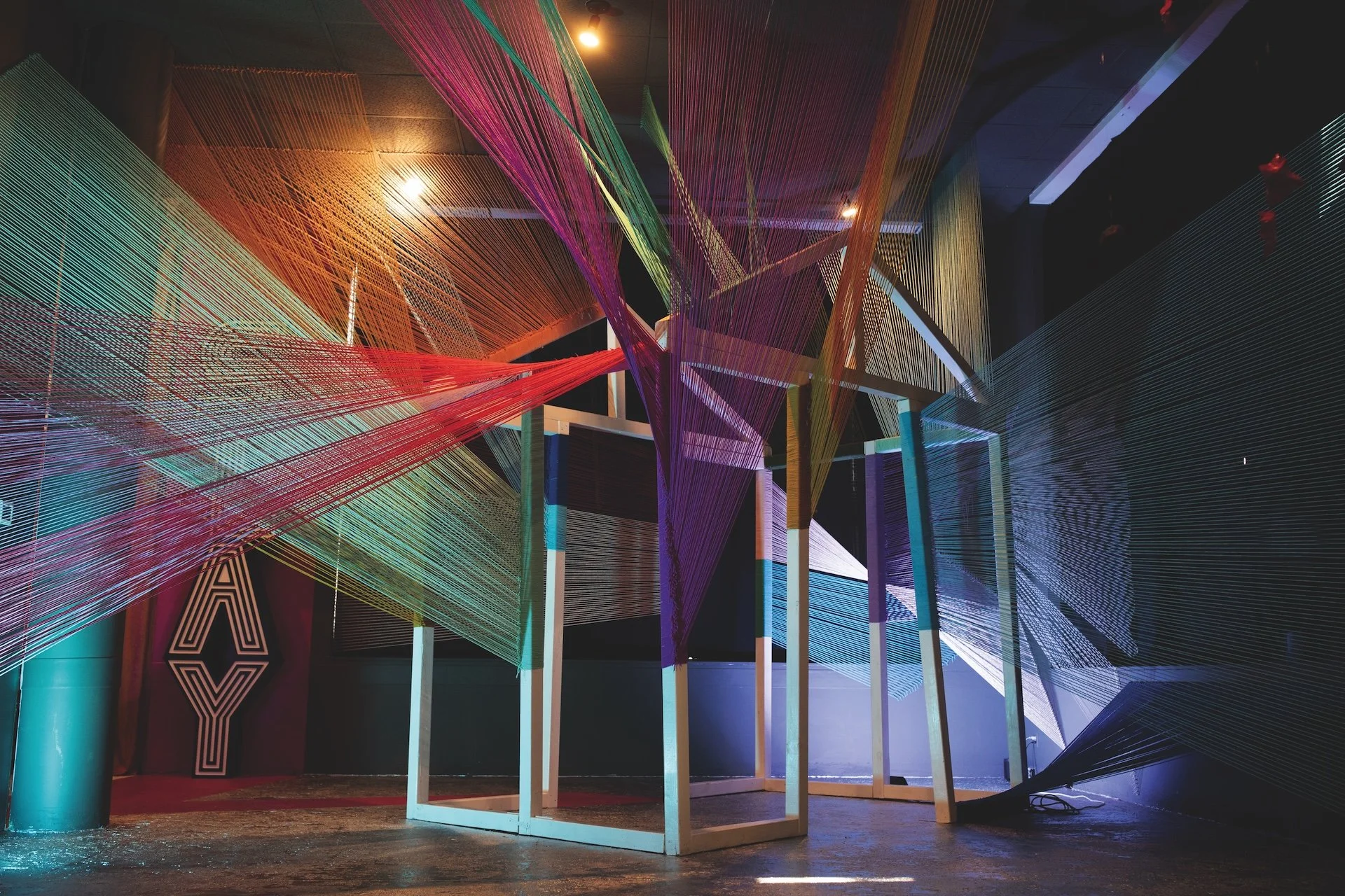 Many of the installations showcase Suzanne’s knack for elevating humble materials. An intricate string art piece commands one wall, while a cardboard “explosion” sculpture—built entirely by their team—is one of her personal favorites. Collaborator Kat Chelstrom, a longtime Studios Moss team member and muralist, helped bring the space to life with bold, hand-painted elements.