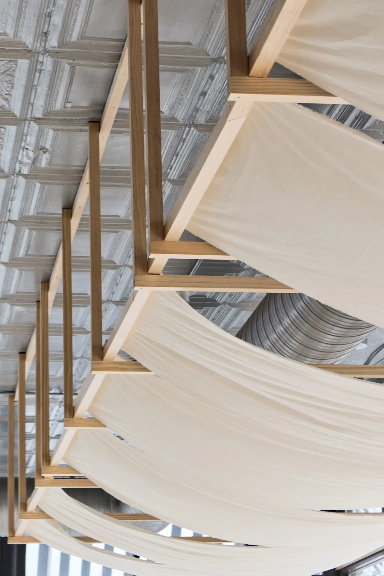 Details throughout reflect that design philosophy. Pegboard and plywood paneling soften the space and reference packaging elements. A sweeping draped textile ceiling structure designed by Keep not only diffuses light and sound but adds a sense of movement—like an unfurled label. Cabinetry left from the previous tenant was given a facelift, while custom retail tables, designed with Potluck, a local studio, were created with minimal waste in mind, using offcuts from the three main Baltic birch tables to fabricate five additional displays.