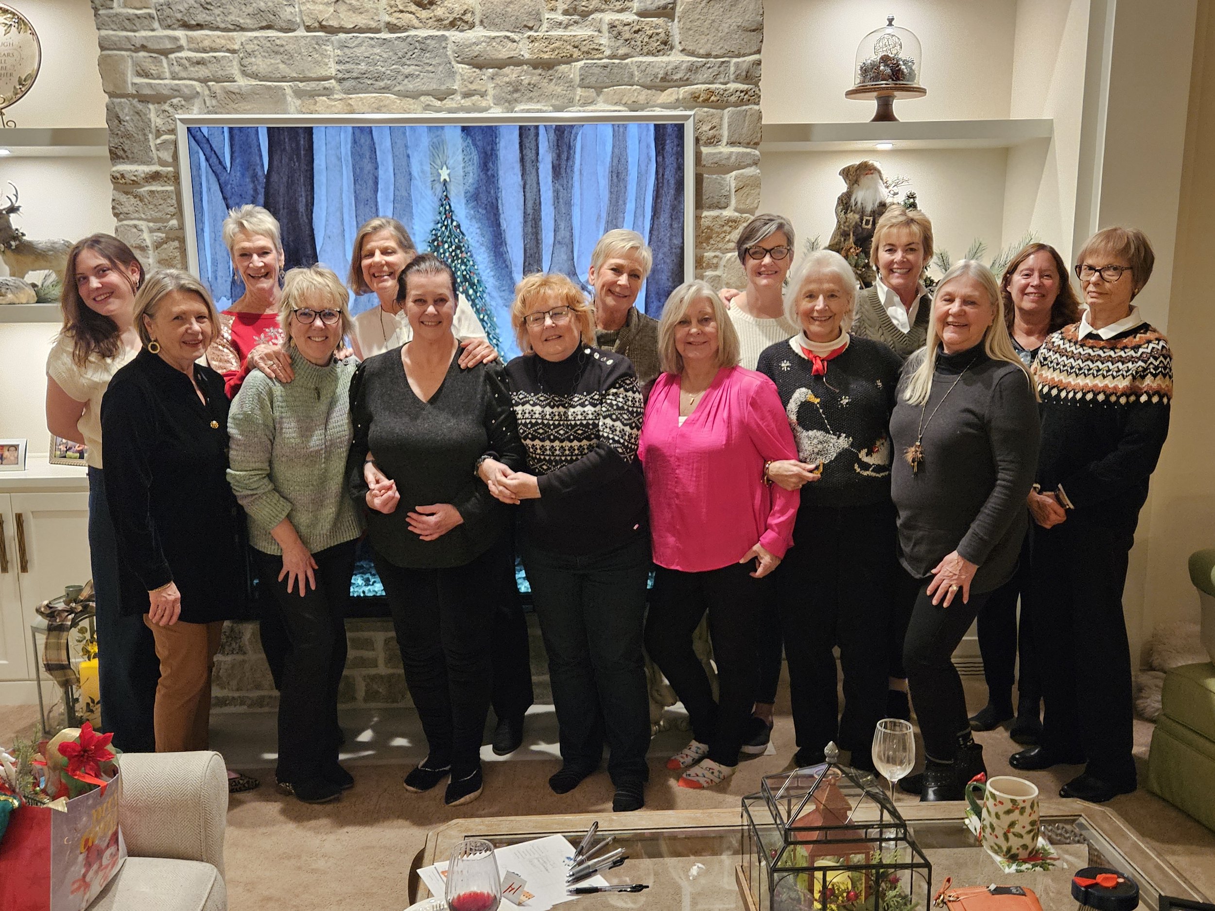 A photo of the book club at their annual Christmas party.
